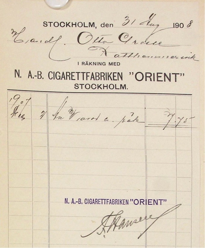 Enligt hvad vi försport har den amerikanska tobakstrusten inköpt alla aktier i aktiebolaget Cigarrettfabriken Orient härstädes. Händelsen är ägnad att väcka det största uppseende, ty därmed synes ett första försök vara gjordt från den amerikanska trustens sida att få fast fot i Sverige liksom förut i andra land och så småningom lägga under sig hela vår fabrikation på tobaksindustriens område.